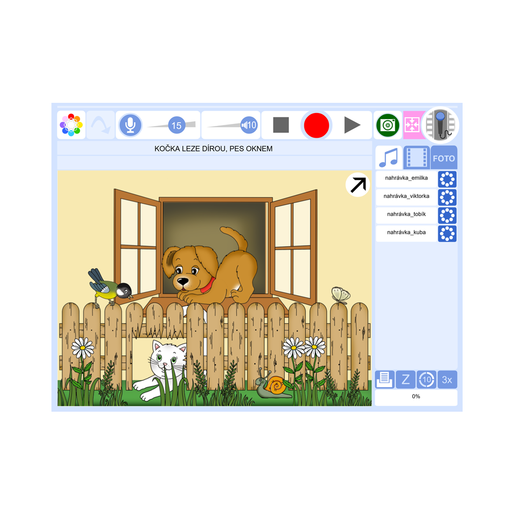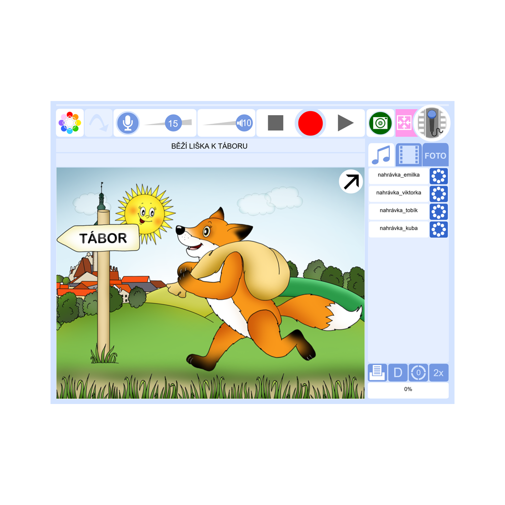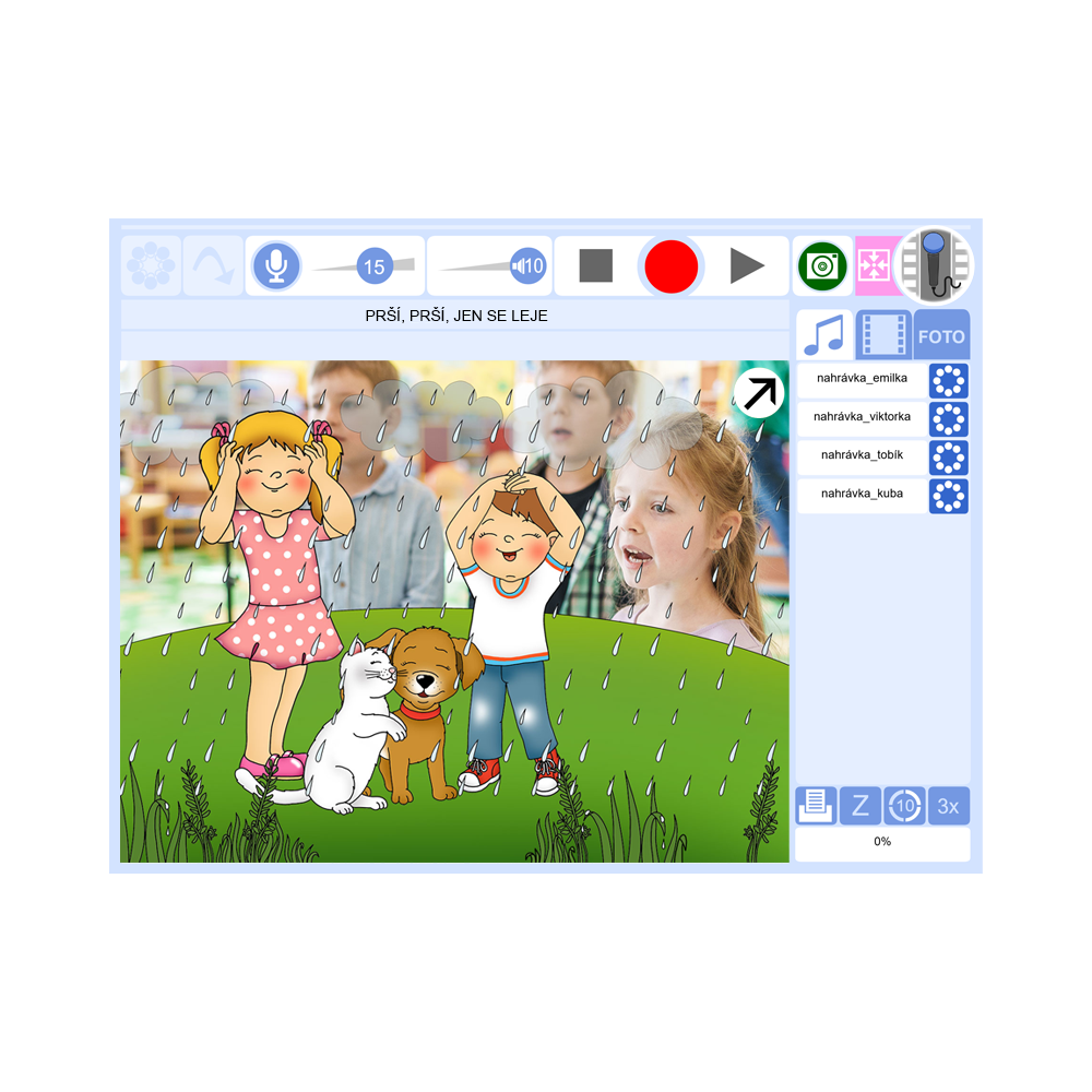 Pokud připojíte externí USB webkameru nebo využijete vestavěnou kameru na přístroji, můžete nahrávat k animaci i záběry dětí z kamery. Obraz se promítá do pozadí za probíhající děj písničky (bod 7).