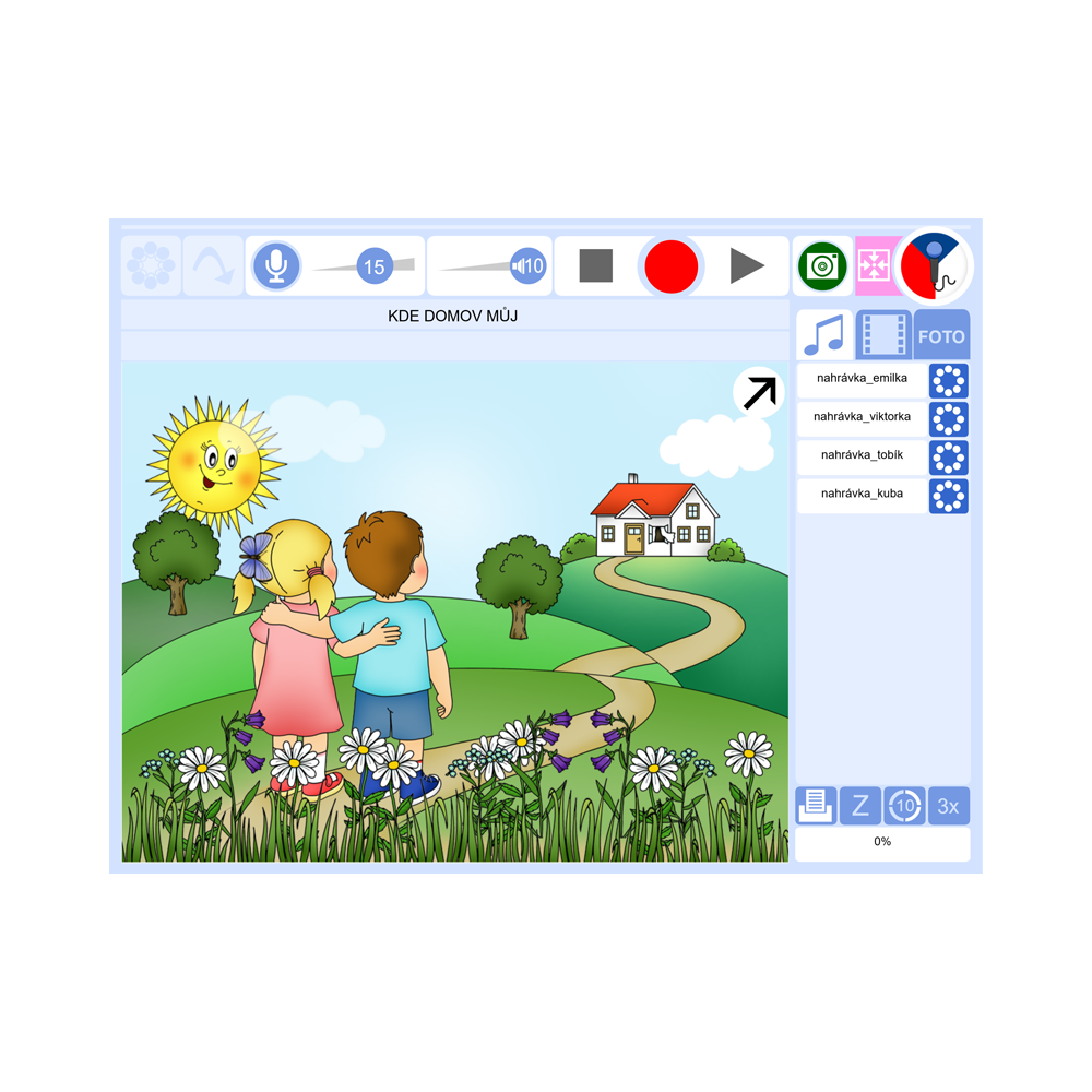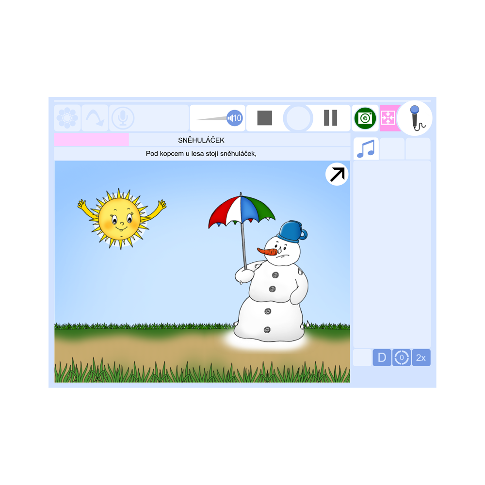 Program Zpívá celá školička využijete i bez mikrofonu nebo kamery, jak uvádíme v bodech 1 - 5. Připojíte-li mikrofon nebo využijete vestavěný mikrofon displeje, můžete nahrávat zpěv nebo i zpěv s animací (bod 6).